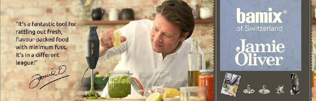 Jamie Oliver o spolupráci s bamixem® říká: „Jsem nadšený, že můžu spolupracovat se značkou bamix® a pomoci lidem rychle připravit úžasná jídla zcela od nuly. Tento geniální vynález je opravdový pomocník, kterého si budete chtít nechat a je vyrobený tak, aby vydržel navěky. Svůj mixér bamix® mám doma v kuchyni vždy při ruce a používám ho na spoustu různých věcí, např. na výrobu salsy, dresinku, voňavé kari pasty nebo pesta. Je to úžasný nástroj pro rychlou přípravu čerstvého jídla plného chutí, a to s minimální námahou. Je to jiná liga!“