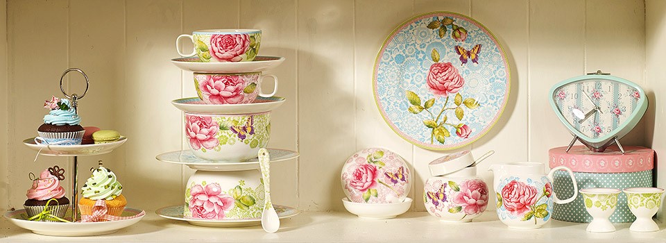 Moderní vzor růží ve spojení s romantickým stylem venkovského nádobí – rozkošná kolekce Rose Cottage přímo vyzývá ke snídani v posteli i čajovým dýchánkům s atmosférou jako z kouzelného zámku.