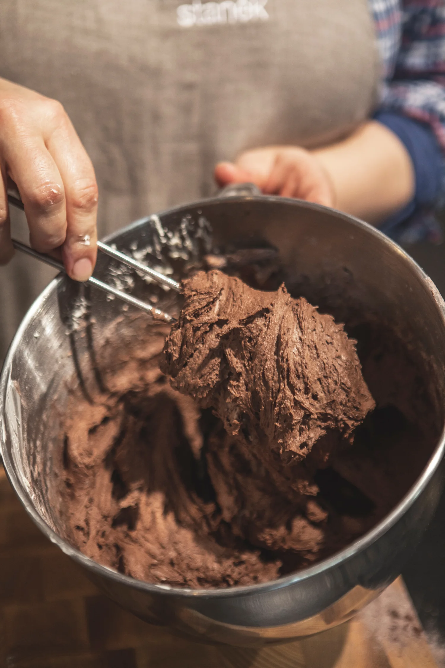 3. Do máslové pěny přišlehejte vejce a pak ručně pomocí gumové stěrky vmíchejte promíchanou suchou směs (kakao s moukou a rozmarýnem).