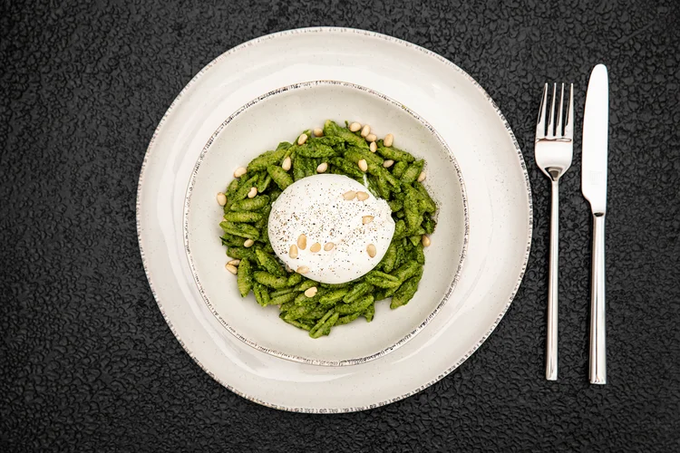 Nevím, jak moc je originální – je inspirovaný mým milovaným jídlem z restaurace Nuova, které si tam dávám už několik let v kuse. Jsou to těstoviny gnocchetti se špenátovým pestem a burratou navrchu!