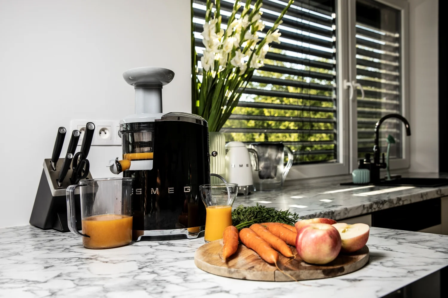 Dobrá pánev, kvalitní nůž a rychlovarná konvice SMEG.