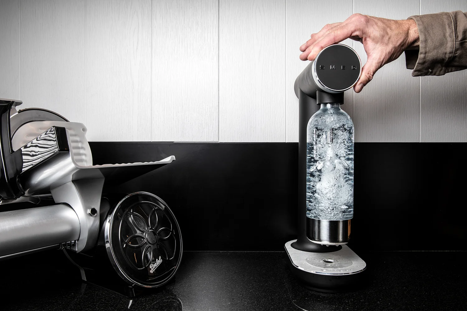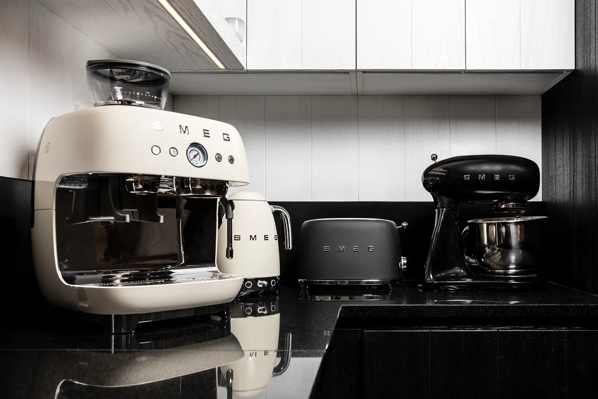 Kvalitní nůž, litinová pánev a SMEG kávovar.