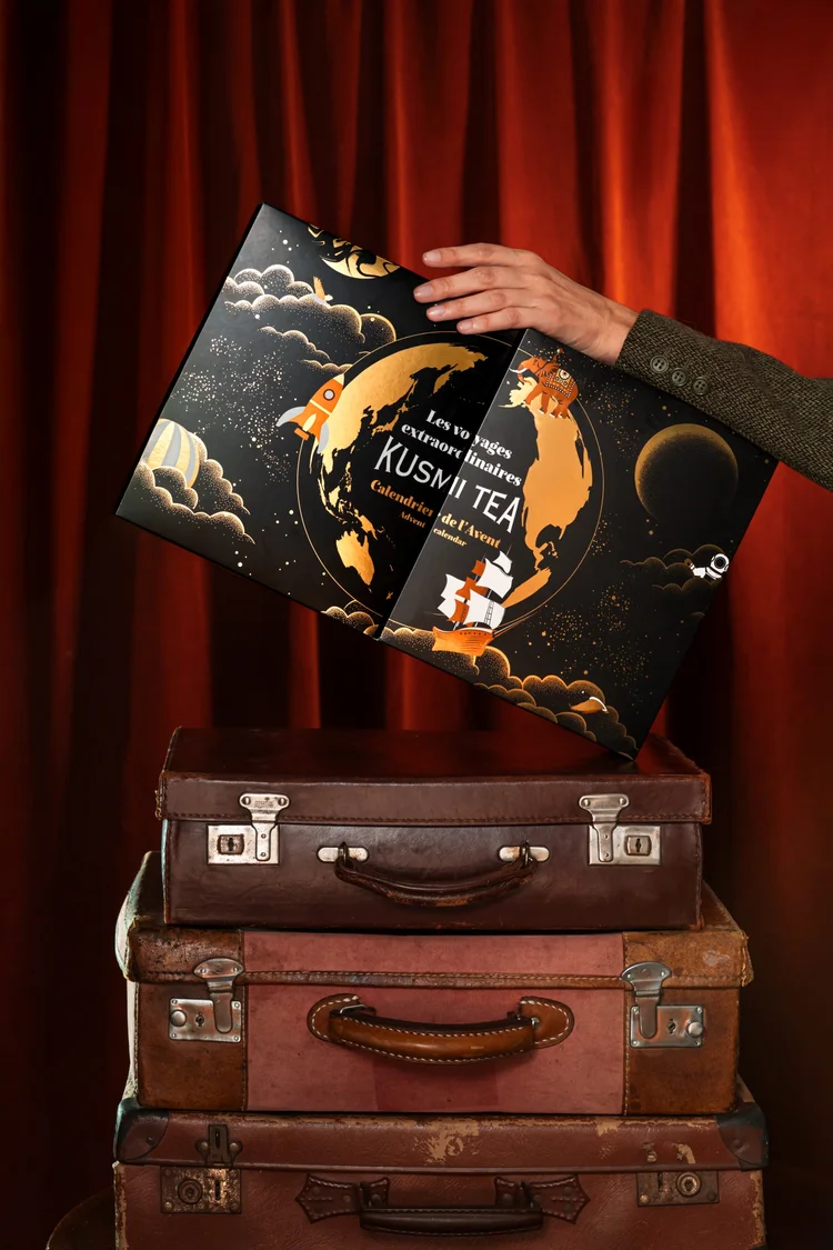 Navržený jako lodní deník velkého cestovatele. Každý den odhaluje nové dobrodružství. S kalendářem Kusmi Tea se vydáte na poetickou výpravu až k samému srdci Vánoc.