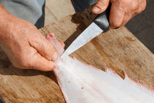 Platýsovité ryby mají vždy 4 filety. Z každé strany tak odříznete filetovacím nožem dva filety. Odřezané zbytky ryby můžete pak použít na přípravu rybí polévky.
