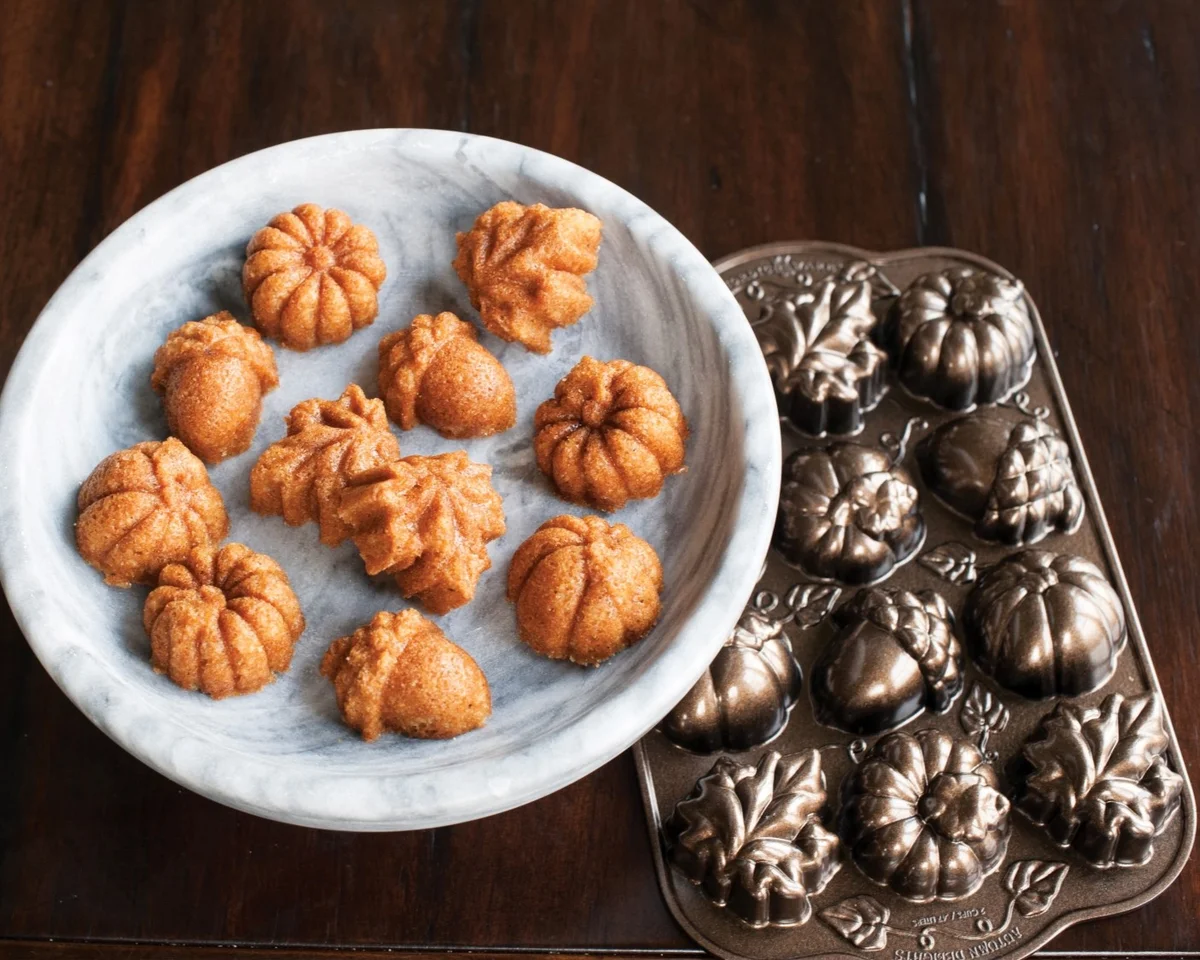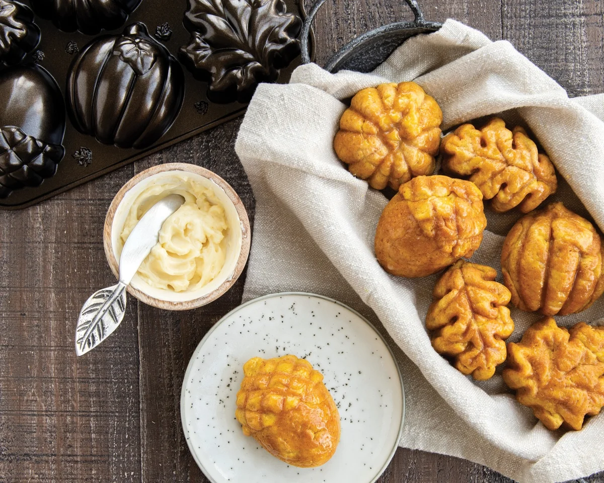 S pečící formou americké stálice Nordic Ware připravíte například mini bábovičky ve tvaru dýně, krocana, javorového listu a žaludu, které potěší jak děti, tak i dospělé strávníky. Plát se 16 šestnácti výlisky je vyroben z kvalitního litého hliníku, který zaručuje perfektní rozvod tepla. Nepřilnavý povrch zase zajistí, že vaše výtvory se vždy krásně vyklopí. Upečené dezertíky můžete podávat buď samostatně, nebo po dvojicích jako originální bábovkový sendvič.