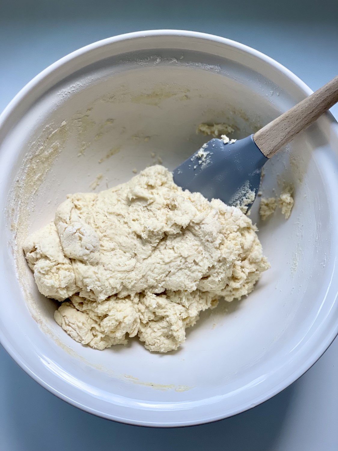 2. Přidejte koření a sůl, citronovou kůru, potom mouku s práškem do pečiva a dobře vypracujte lehce lepivé těsto.