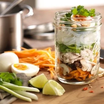 - Postupně vrstvěte všechny suroviny do sklenic, začněte mrkvovými proužky a houbami shiitake, nakonec navrch položte poloviny vajec. Přidejte listy koriandru a pražené arašídy. Pro pikantnější variantu přidejte do sklenice několik velmi jemně nakrájených koleček chilli. Sklenice uzavřete šroubovacím víčkem a uložte do chladu.