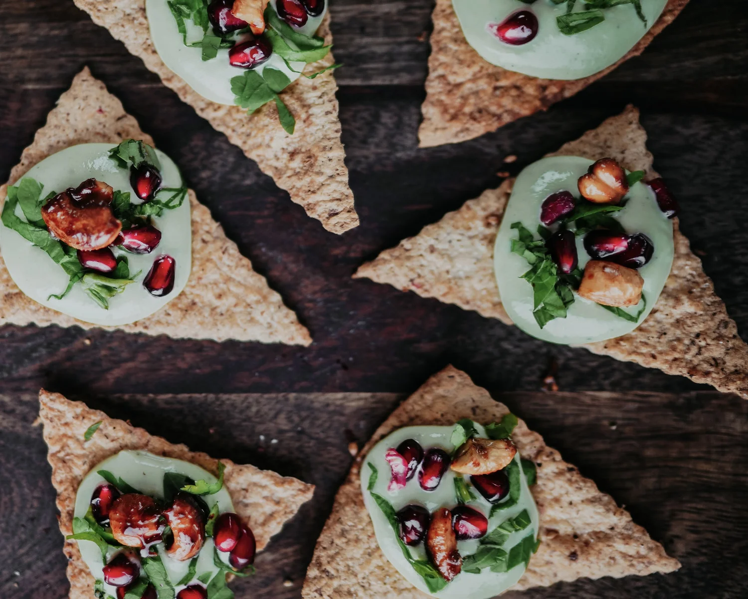 - Na vychladlé trojúhelníčky dejte lžičku šlehané fety, ozdobte bylinkami, granátovým jablkem a ořechy.