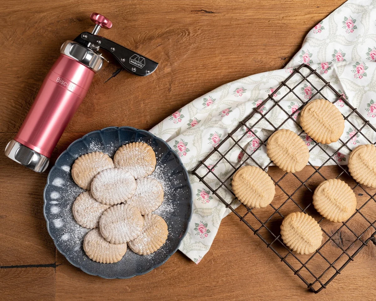 - Nyní přichází čas tvarování malých sušenek. Připravte si proto strojek Marcato a vložte do něj část těsta. Poté zvolte jeden z 20 tvarů a upravte také výslednou mocnost sušenky pomocí nastavitelného kolečka pod pákou.